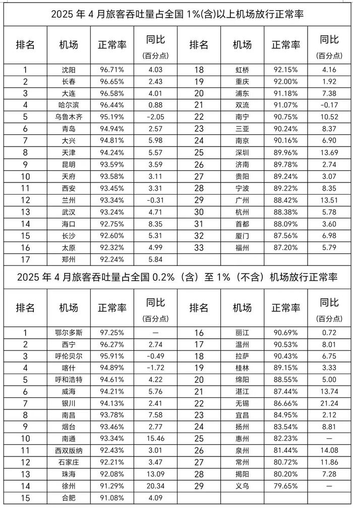 国内主要机场按照2023年旅客吞吐量划分,分为旅客吞吐量占全国1%(含)以上机场及0.2%(含)至1%(不含)机场。2025年4月国内主要机场平均放行正常率91.47%,同比上升5.53个百分点。