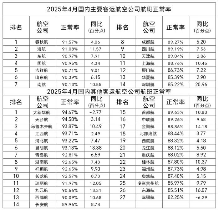 据中国民用航空局消息,2025年4月国内客运航空公司平均航班正常率89.87%配亿多,同比上升8.44个百分点。2024年执行的航段班次占国内客运航空公司总航段班次2%(含)以上的航空公司为国内主要客运航空公司。执行的航段班次占国内客运航空公司总航段班次2%以下的航空公司为国内其他客运航空公司。
