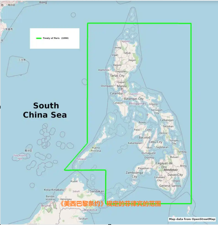 在会上他明确指出,菲律宾的领土范围由1898年12月10日《美西条约》(全称《美西巴黎条约》)的具体签署而划定。将菲律宾的西边界限定在东经118°线,而黄岩岛、南沙群岛均位于此线以西。